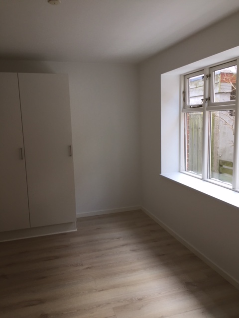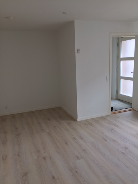 Stor stue og soveværelse, begge malet i lyse indbydende farver med dertilhørende nye flotte gulve.